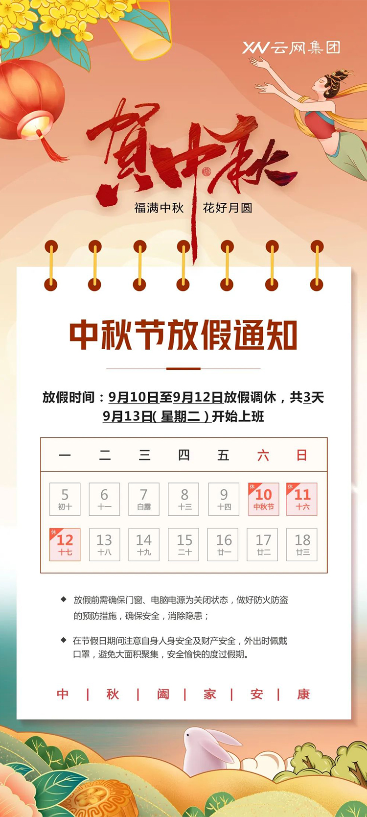9月10日至12日(周六、周日、周一),放假3天。